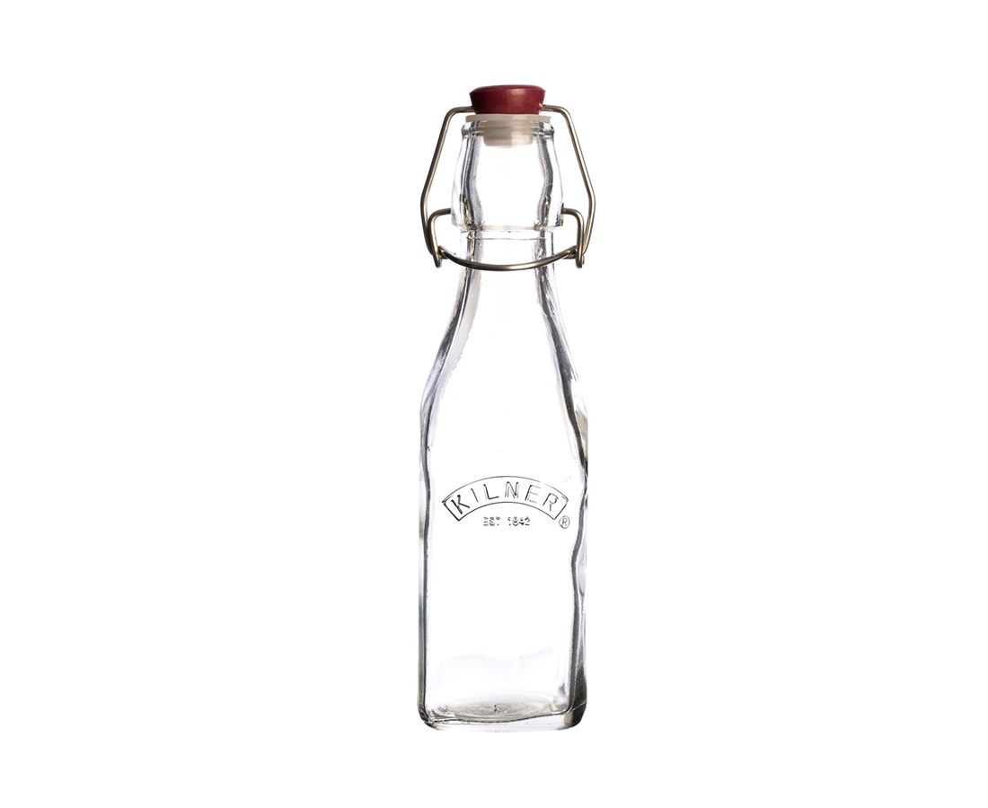 Квадратная бутылка выполнена из стекла и украшена логотипом бренда Kilner. Она оснащена защёлкивающейся пластиковой пробкой, которая плотно прилегает к краям горлышка и не пропускает воздух. Бутылка прекрасно подойдет для хранения самых разных напитков, например, для соков, лимонадов, молока, а также масла и уксуса. Объём 250 мл.