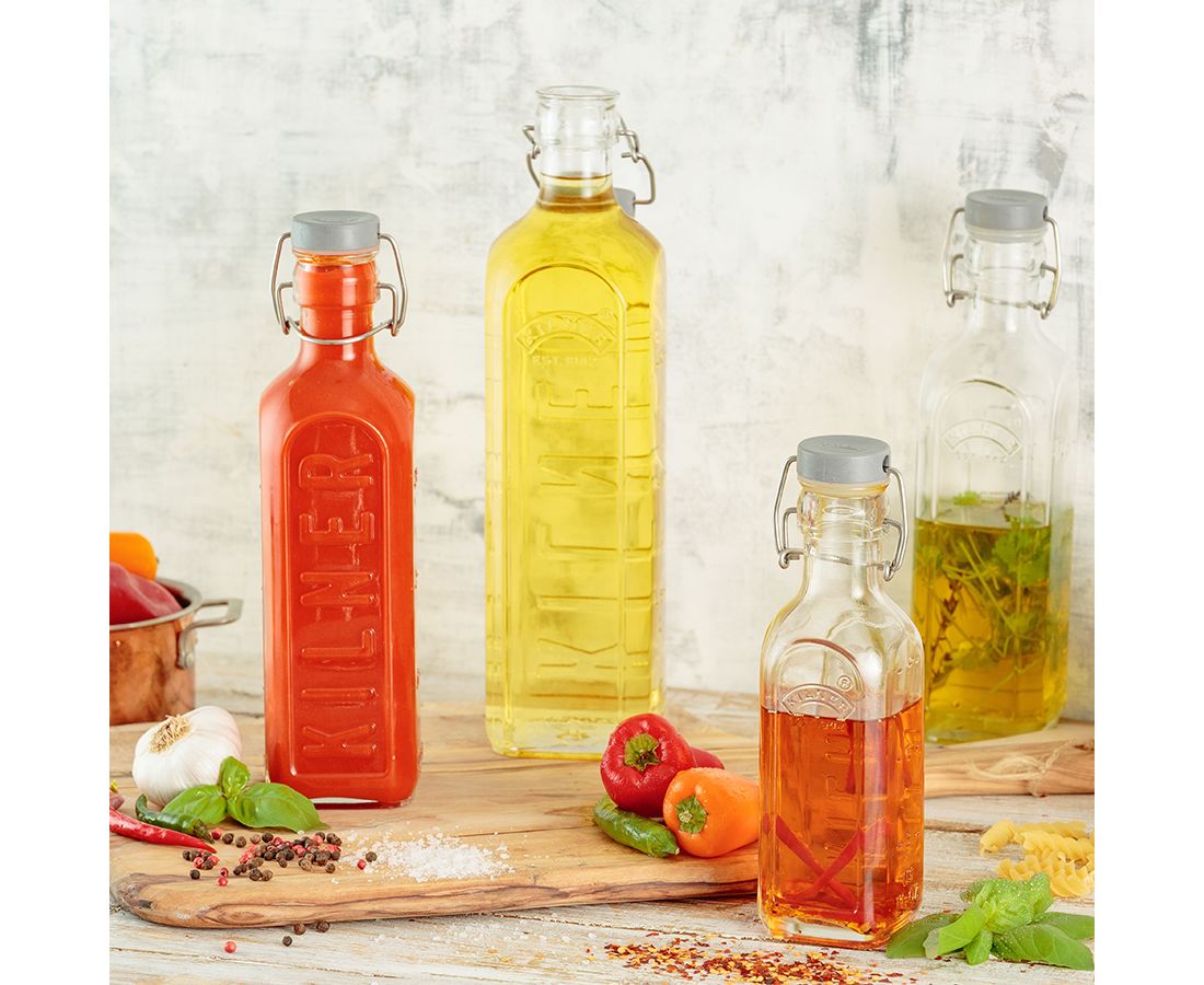 Квадратная бутылка Clip Top с мерными делениями прекрасно подойдет для хранения самых разных жидкостей: масла, уксуса, соуса, сиропа или ликера. Ёмкость выполнена из стекла и украшена логотипом бренда Kilner. Бутылка оснащена пластиковой пробкой с клипсой, благодаря чему горлышко герметично закрыто и не пропускает воздух.
