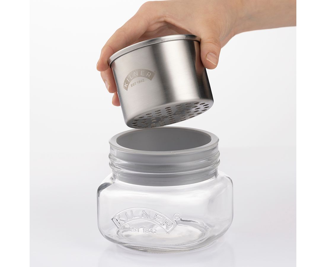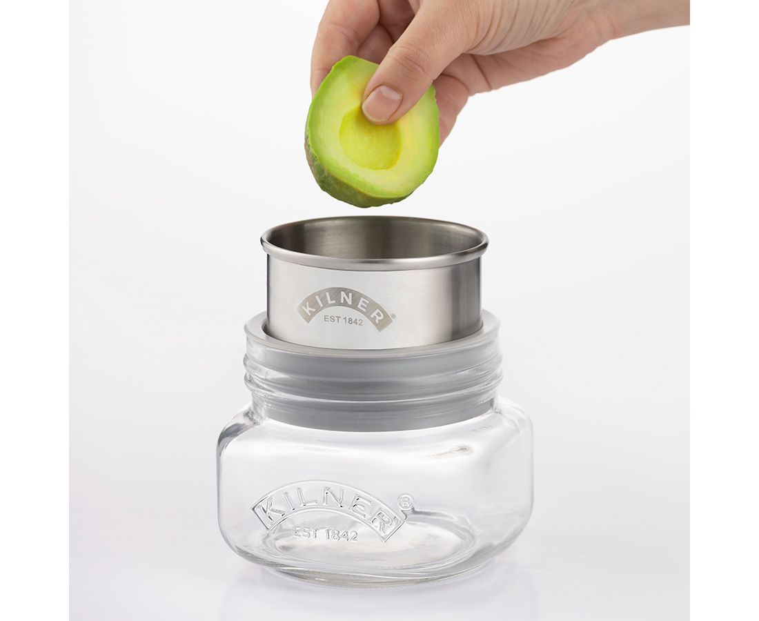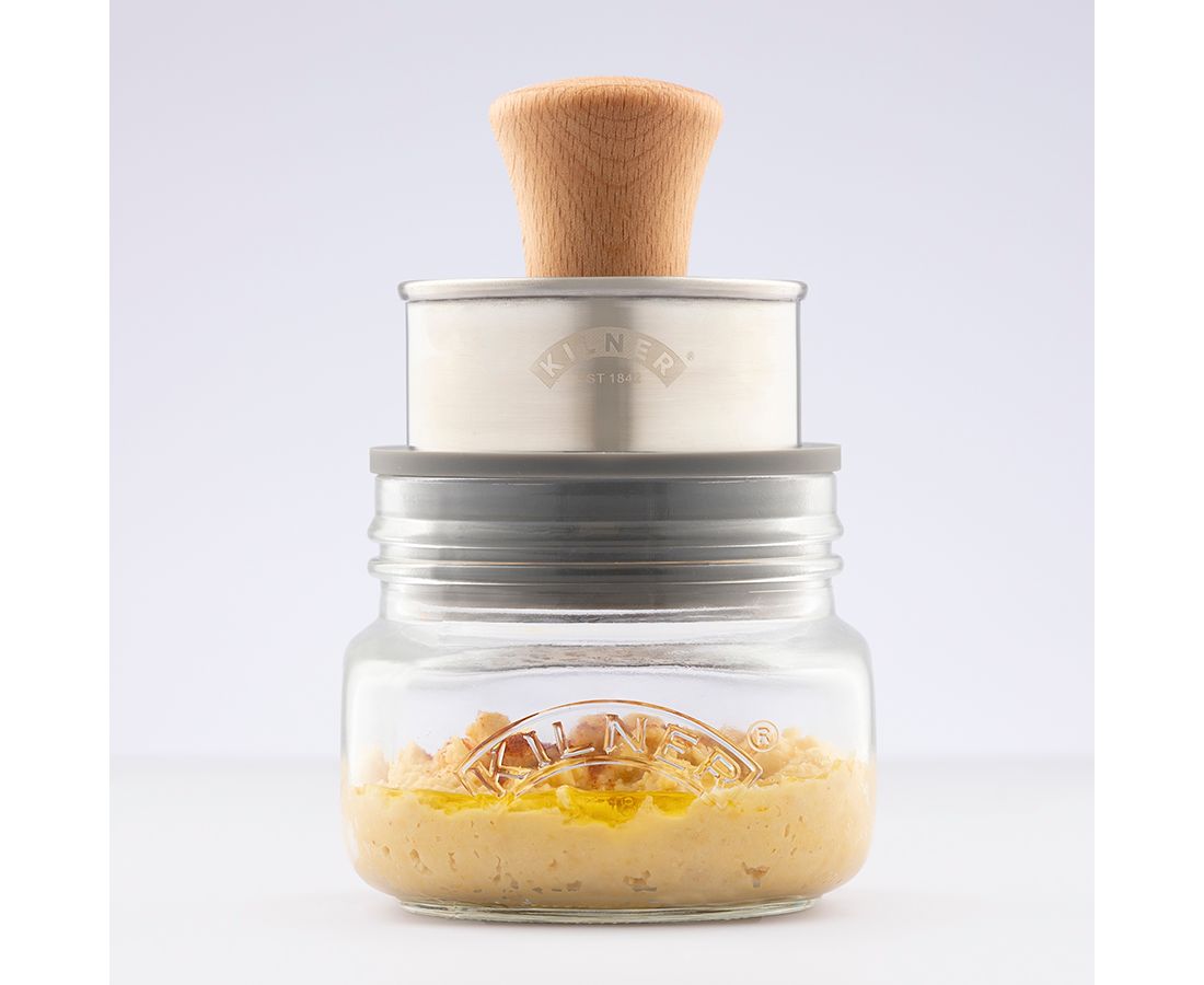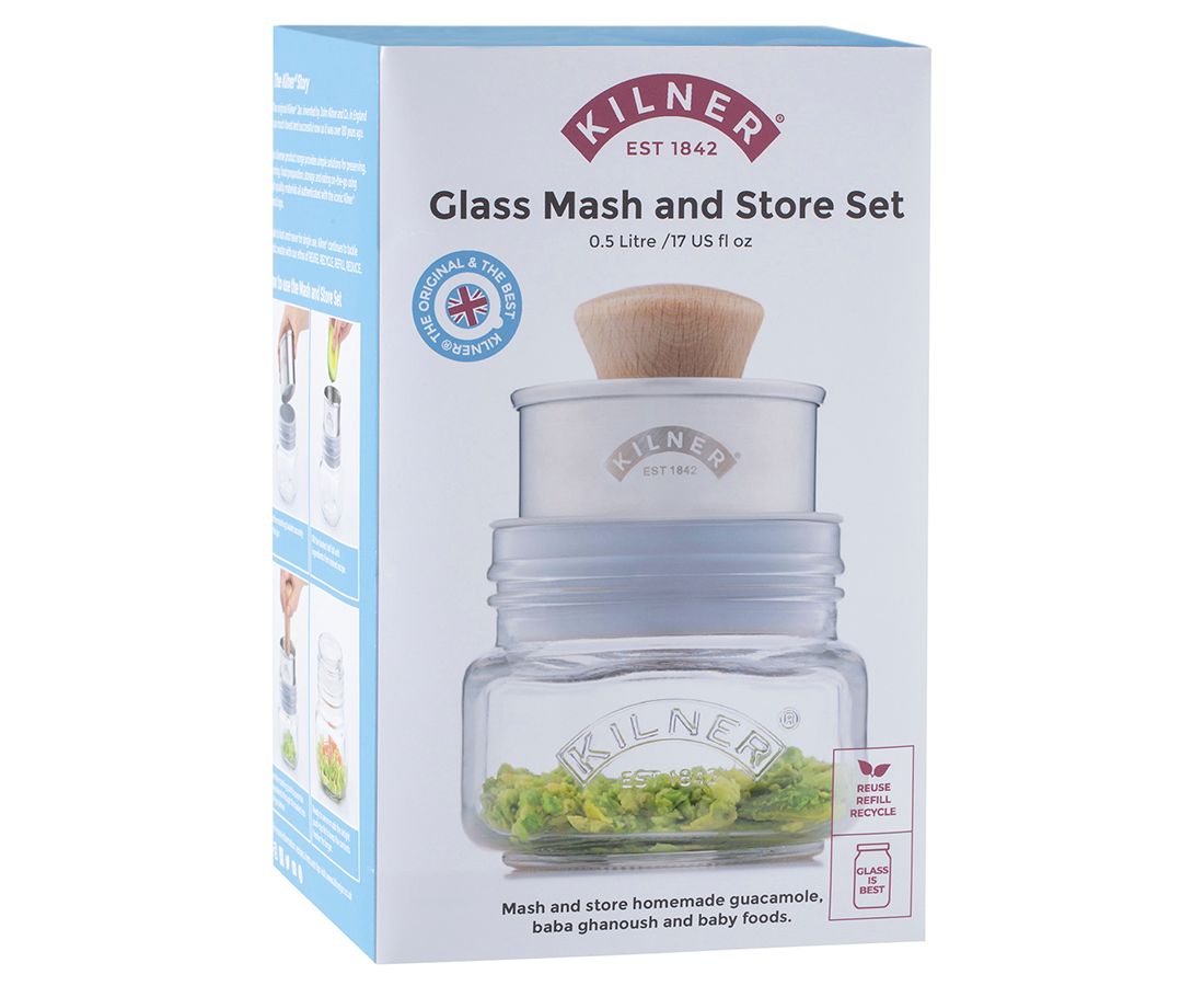 Набор Mash&Store от Kilner предназначен для приготовления и удобного хранения пюрированных продуктов, таких как гуакамоле, хумус, баба гануш, детское питание и других. Для получения пюре просто установите специальное сито на стеклянную банку, положите в него необходимые продукты и разомните их при помощи пресса до нужной консистенции. Хранить готовое блюдо можно в этой же емкости, накрыв ее плотно прилегающей крышкой с силиконовым уплотнителем, которая входит в комплект. Стекло, из которого выполнена банка, отличается высоким качеством, безупречной прозрачностью, не содержит бисфенол-А. Материал не впитывает запахи и не выделяет вредных соединений при контакте с пищей.