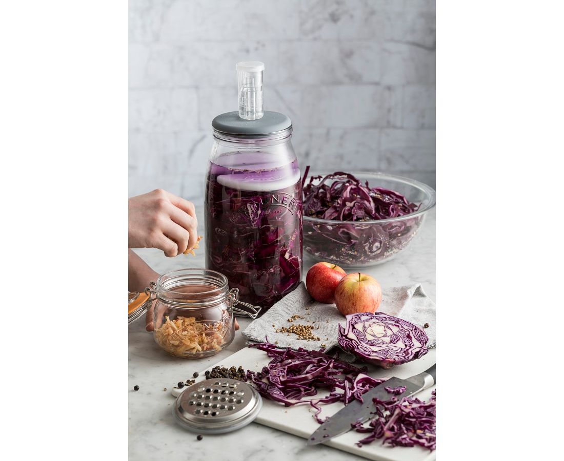 Набор для закваски и приготовления консервов из овощей, таких как квашеная капуста, кимчи, моченые яблоки, гурийская капуста и других солений. В набор входит банка, силиконовая крышка, 2 камня из керамики и специальная пробка.