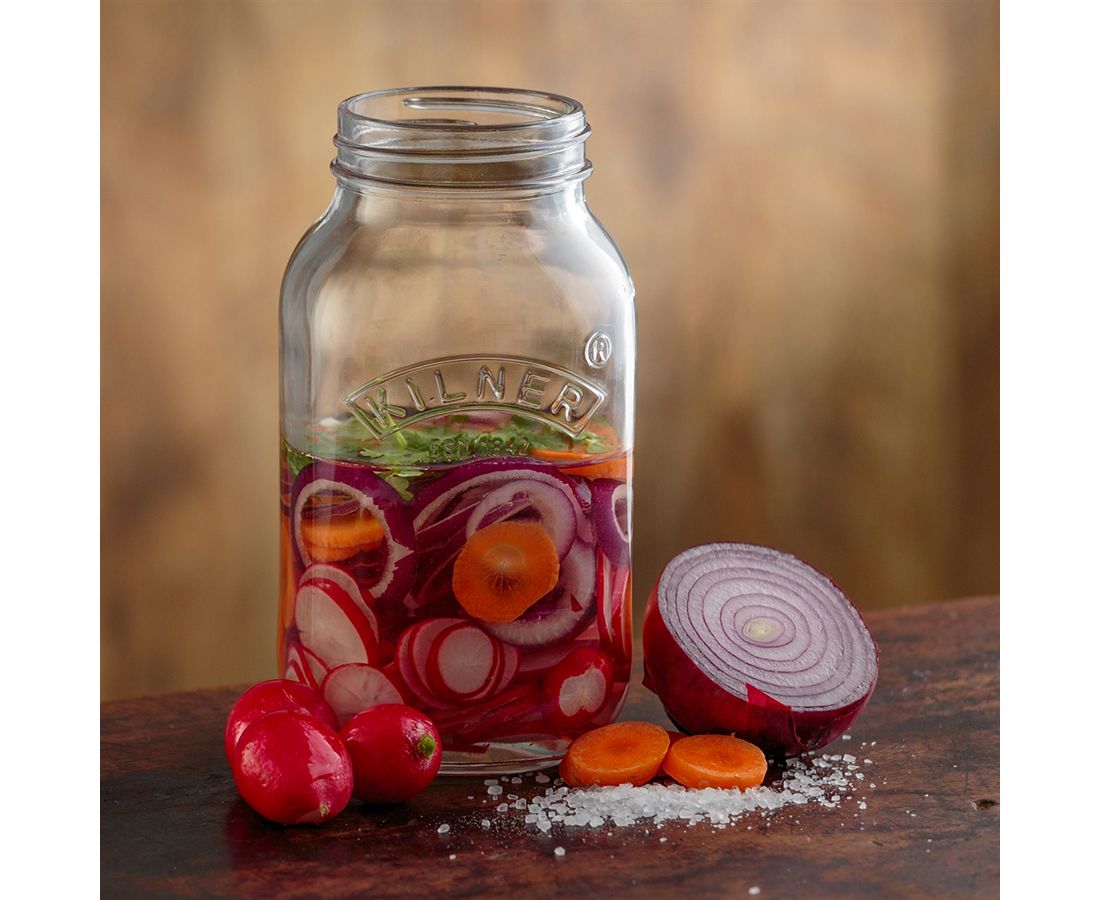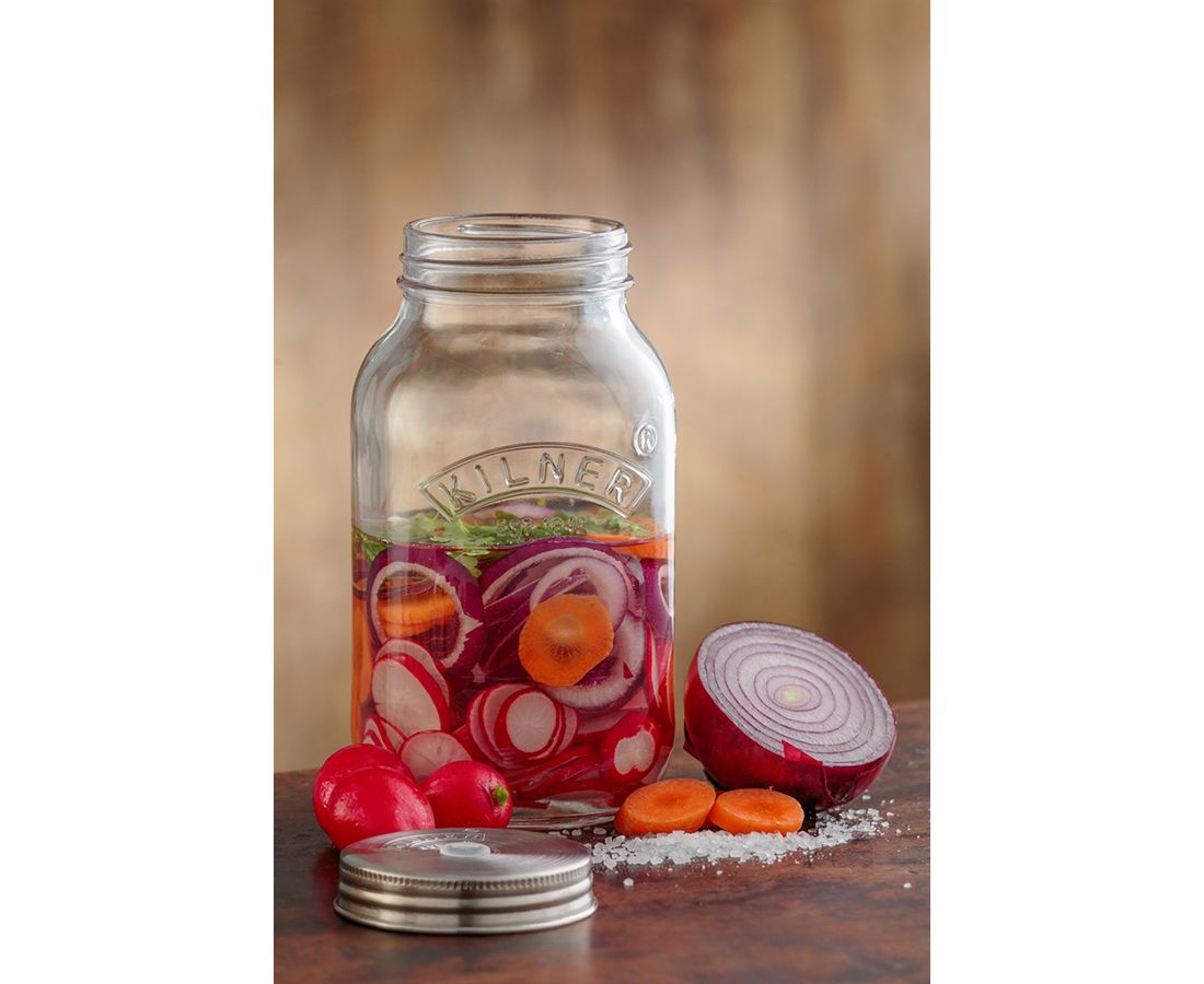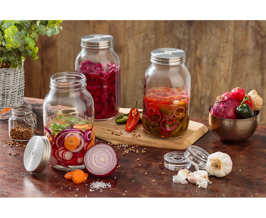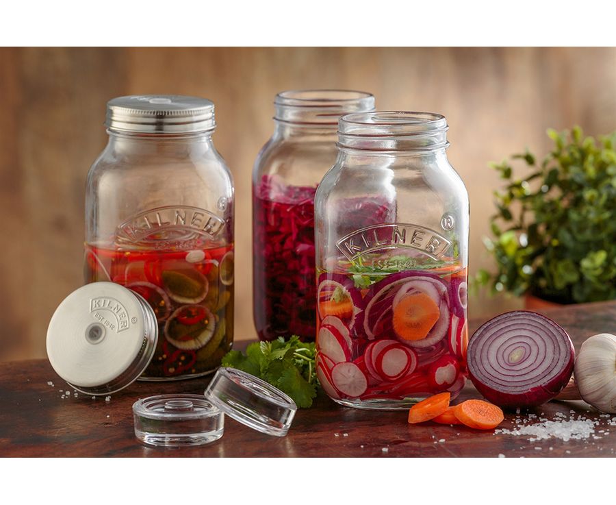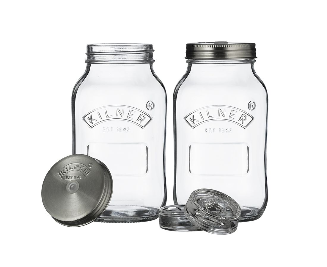 - 2 крышки из нержавеющей стали с логотипом Kilner над отверстием для воздушного клапана